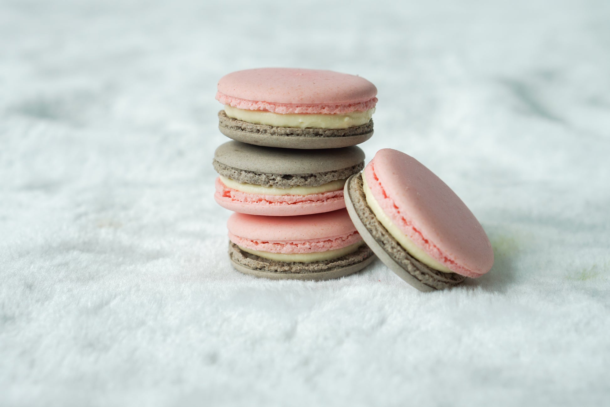 White chocolate ganache infused with the delicate fragrance of rose rea, between a pink and grey macaron shell.