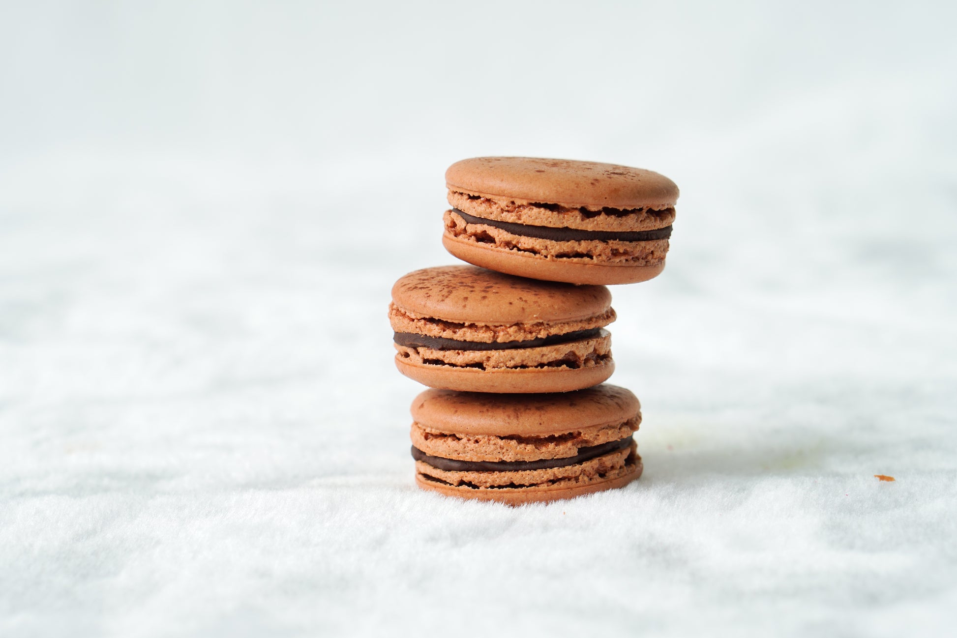 Hazelnut dark chocolate ganache with a crisp centre of hazelnut feuilletine crunch, between two brown macaron shells.