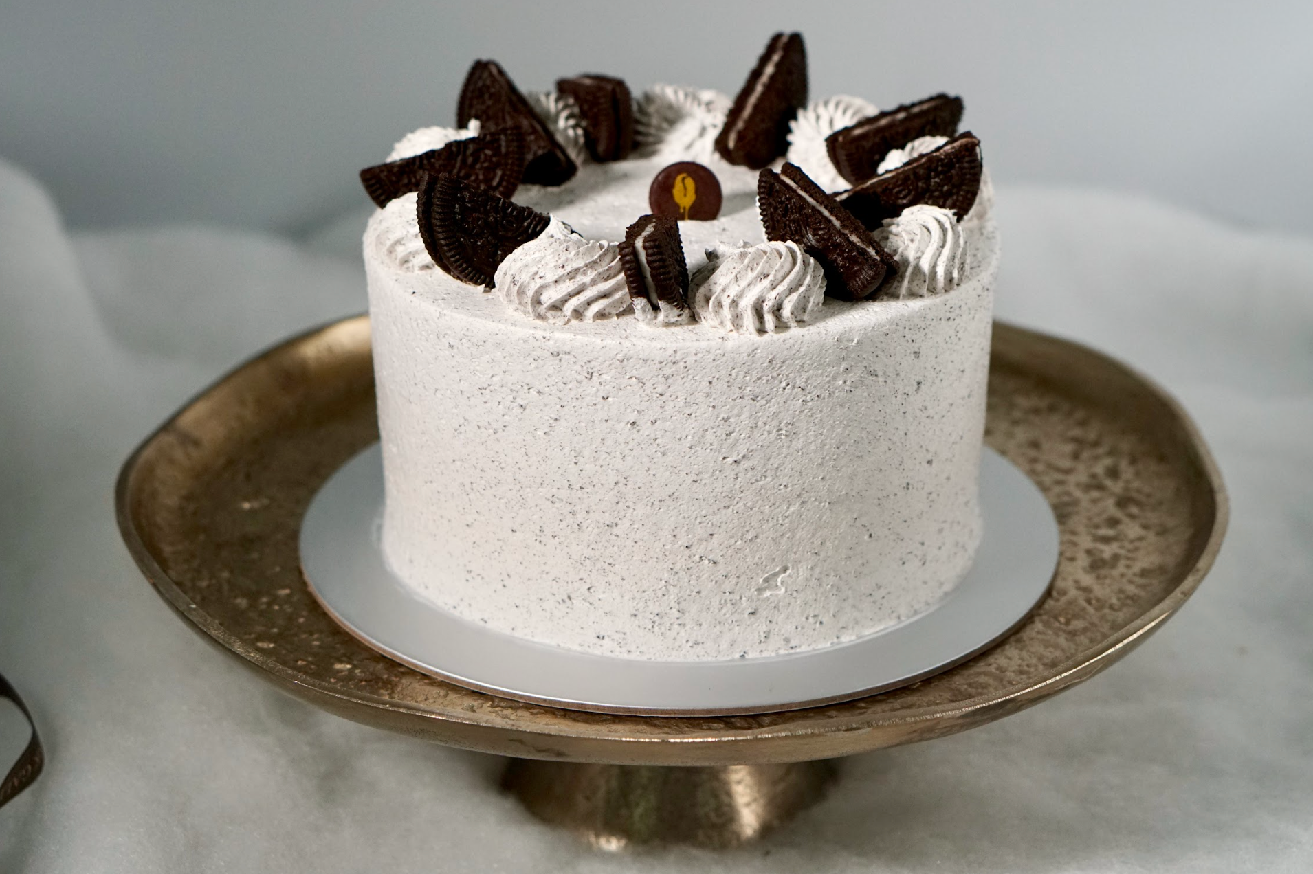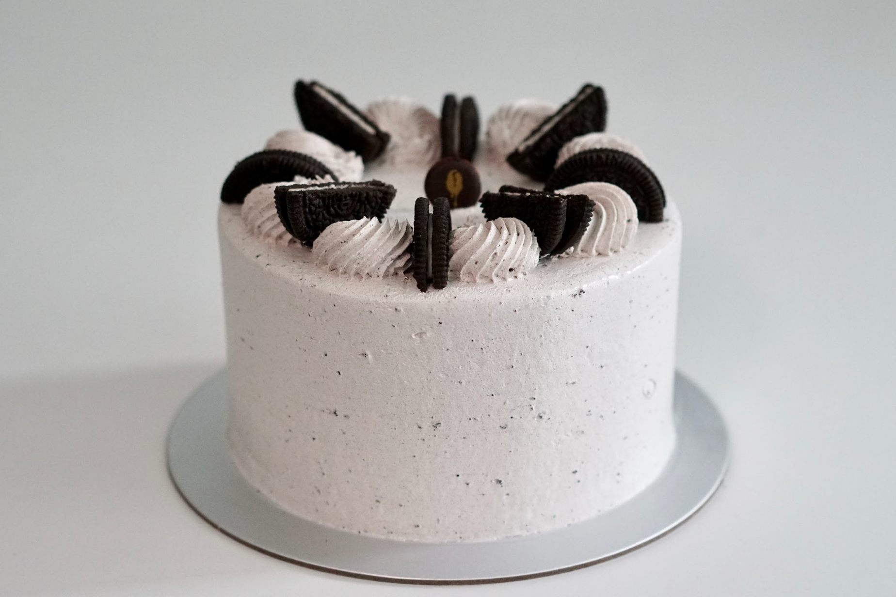Pure Vanilla Ice Cream with crushed Oreos, on a bed of chocolate cake, frosted with Oreo vanilla cream, decorated with Oreos.