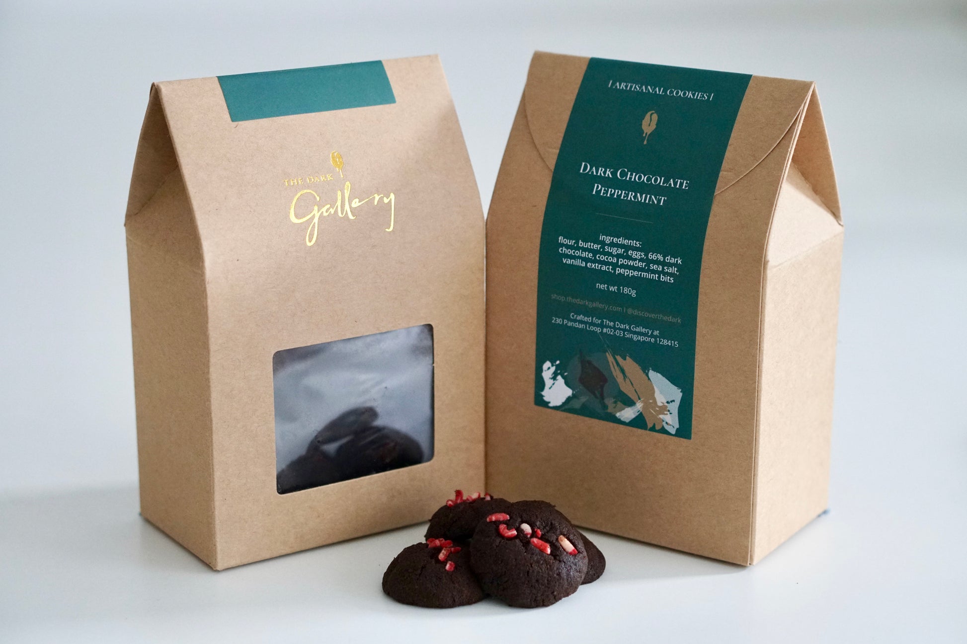 Each box contains a 180g sealed pouch of dark chocolate peppermint cookies.