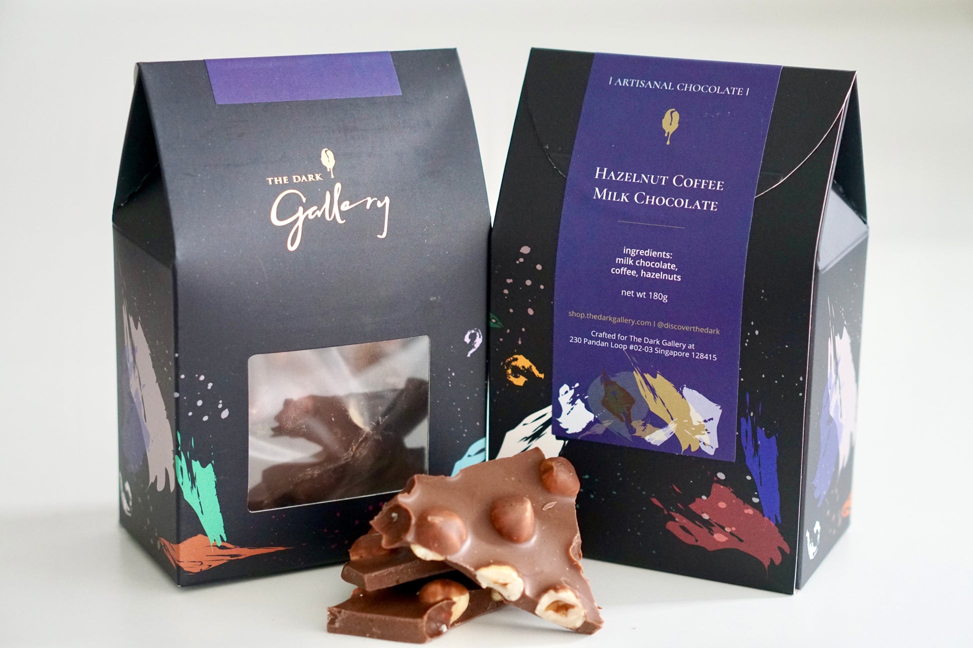 Each box contains a 180g sealed pouch of hazelnut coffee milk chocolate slabs.