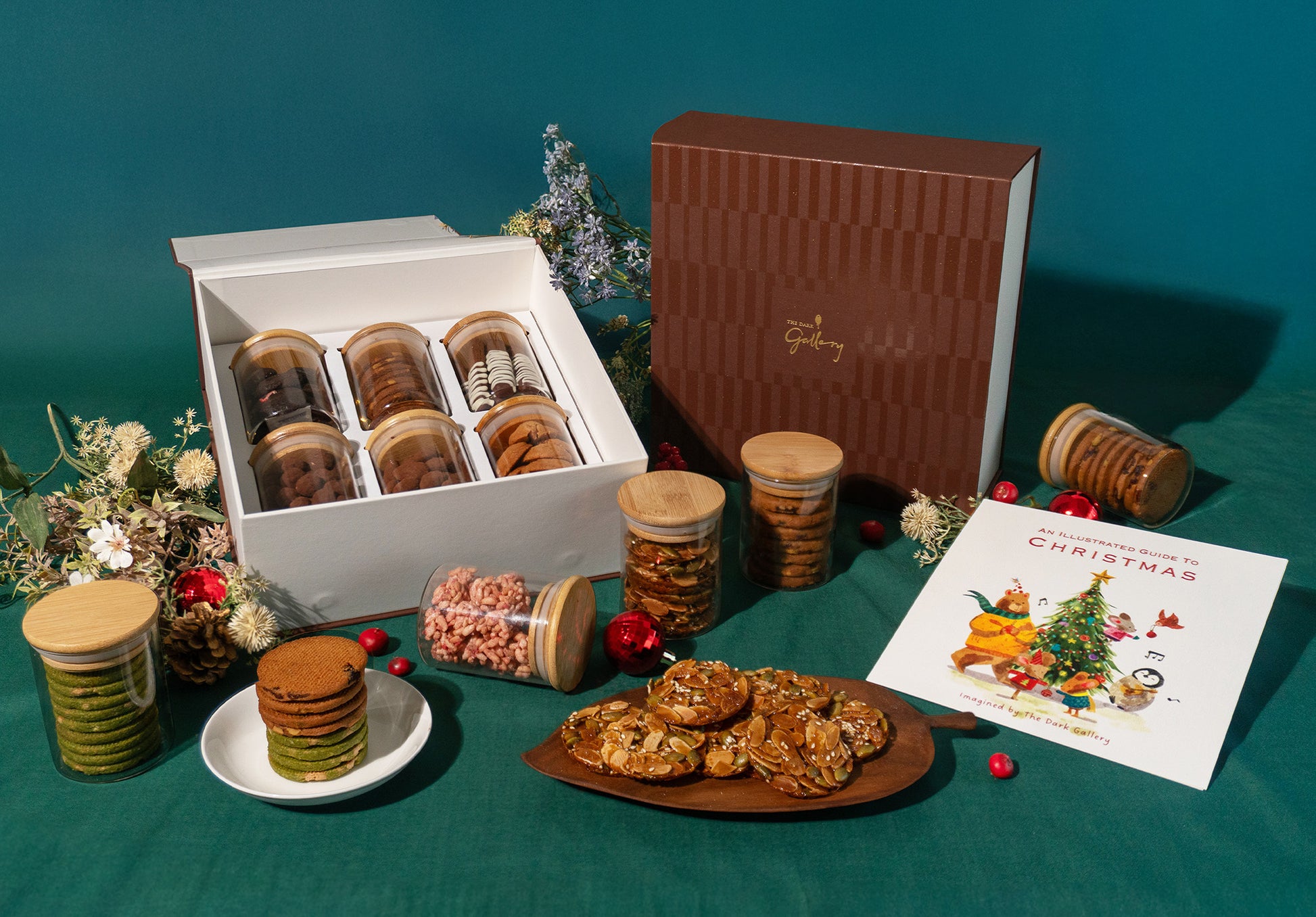Premium Box contains - Dark Chocolate Sablé, Pistachio Cranberry Cookie, Dark Cocoa Almonds, Chocolate Coated Hazelnuts, Chocolate Medallions, Gingerbread Sticks