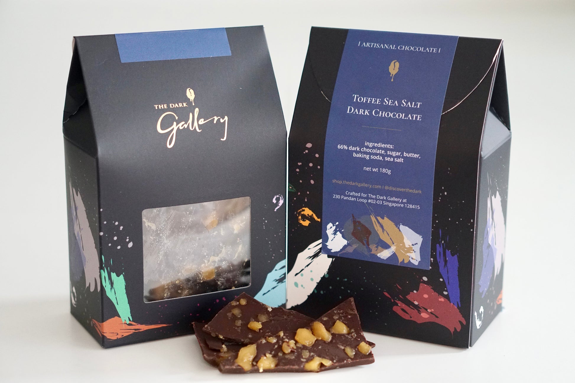 Each box contains a 180g sealed pouch of toffee sea salt dark chocolate slabs.